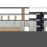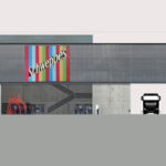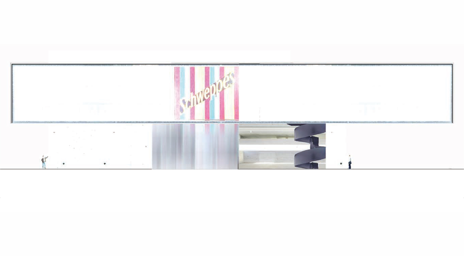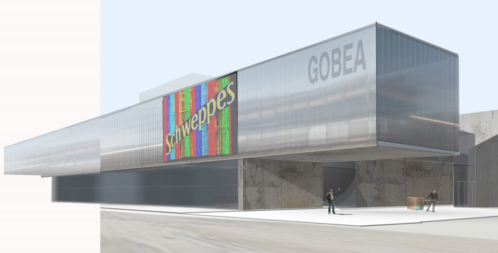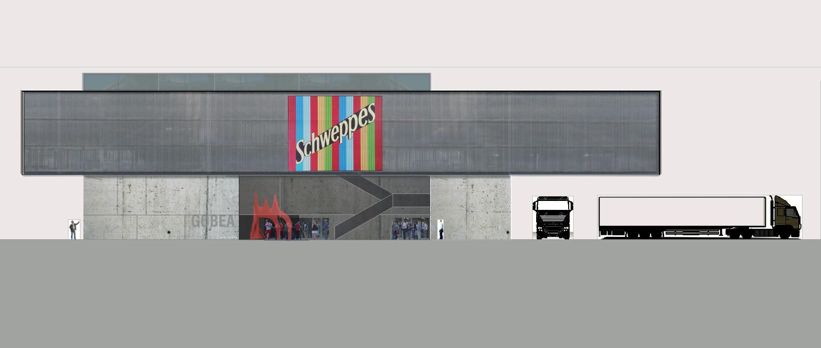 El objeto arquitectónico planteado para resolver el frente, el nuevo alzado a Portal de Zurbano, es rotundo y claro en cuanto a su propuesta formal. Basado en una geometría sencilla, propone un elemento, “a modo de base”, pesado y sólido, materializado en hormigón visto, sobre el que se apoya un prisma rectangular alargado y de concepción ligera, que vuela muy significativamente sobre la zona reservada para las maniobras de descarga. El elemento apoyado tiene vocación de abarcar todo el frente de Portal de Zurbano y, así posado, asumir el protagonismo simbólico del edificio. Su frente se concibe como un paño continuo, ligero y luminoso de policarbonato.